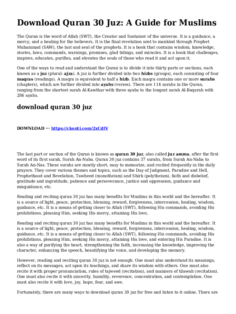 Download Quran 30 Juz: A Guide for Muslims The Quran is the word of Allah (SWT), the Creator and Sustainer of the universe. It is a guidance, a mercy, and a healing for the believers. It is the final