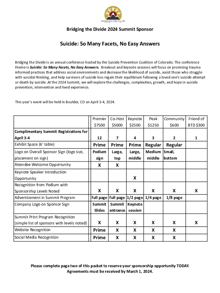 Bridging the Divide 2024 Summit SponsorSuicide: So Many Facets, No Easy Answers Bridging the Divide is an annual conference hosted by the Suicide Prevention Coalition of Colorado. The conference theme