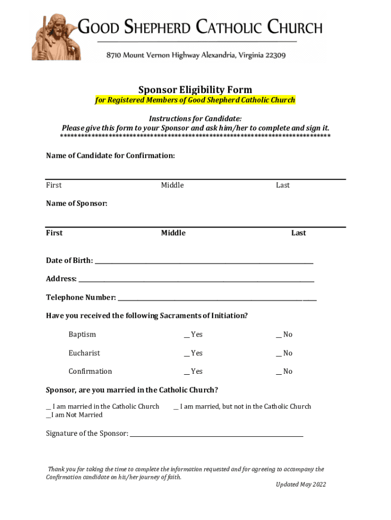 Get the free Sponsor Eligibility Form - Good Shepherd Catholic Church
