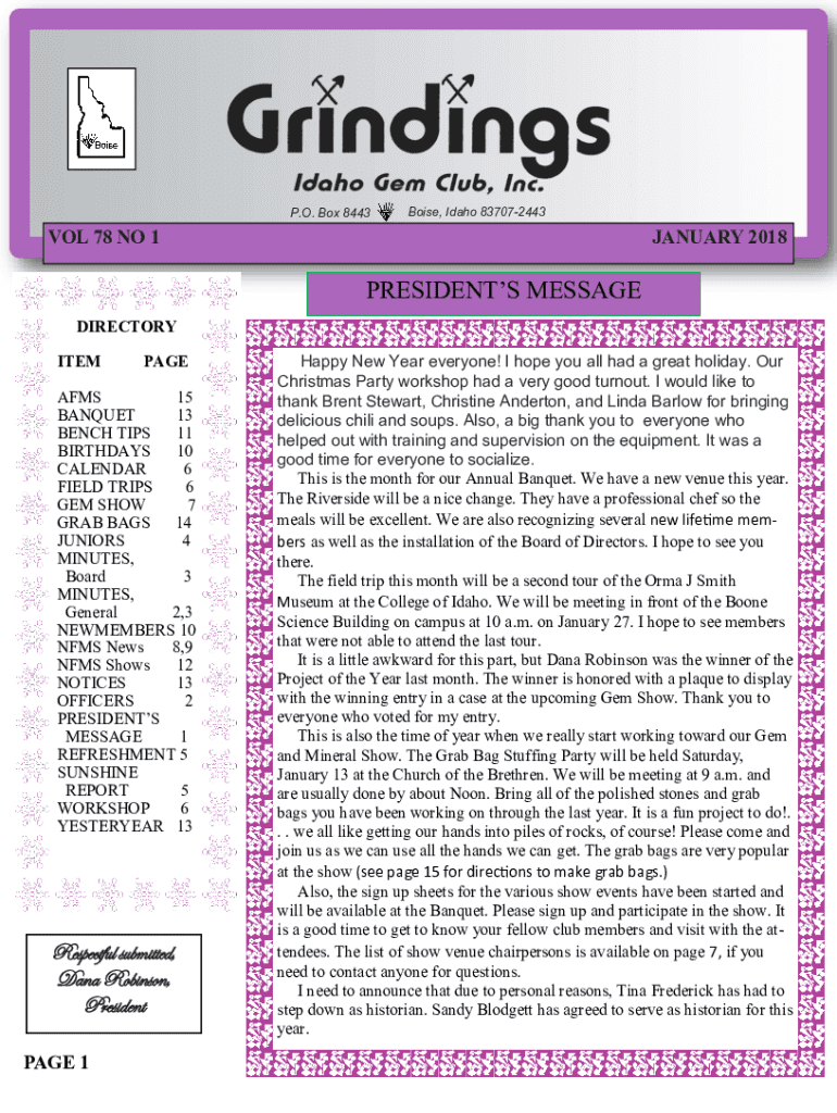 GRINDINGSJANUARY 2018P. O. Box 8443Boise, Idaho 837072443VOL 78 NO 1JANUARY 2018PRESIDENTS MESSAGE