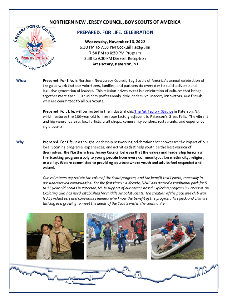 NORTHERN NEW JERSEY COUNCIL, BOY SCOUTS OF AMERICA PREPARED. FOR LIFE. CELEBRATION Wednesday, November 16, 2022 6:30 PM to 7:30 PM Cocktail Reception 7:30 PM to 8:30 PM Program 8:30 to 9:30 PM Dessert