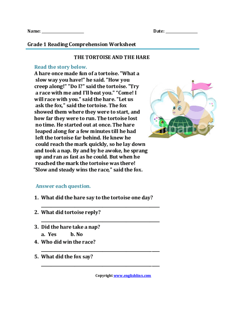 Name: ___Grade 1 Reading Comprehension WorksheetDate: ___THE TORTOISE AND THE HARE Read the story below. A hare once made fun of a tortoise. \"What a slow way you have!\" he said. \"How you creep