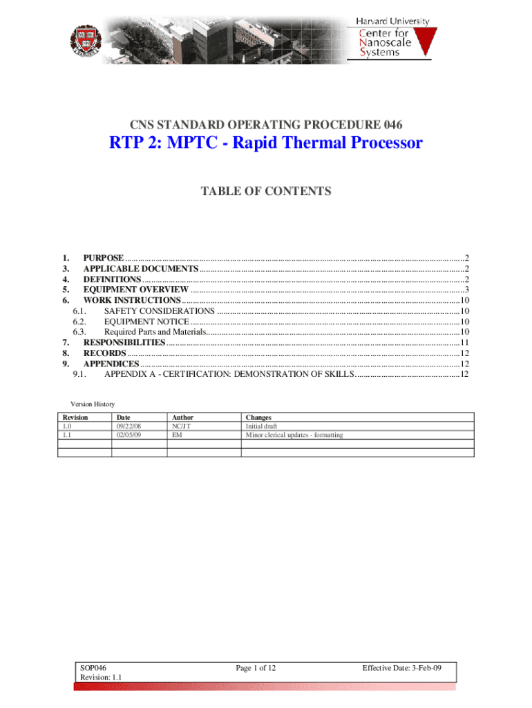 CNS STANDARD OPERATING PROCEDURE 046RTP 2: PTC Rapid Thermal Processor