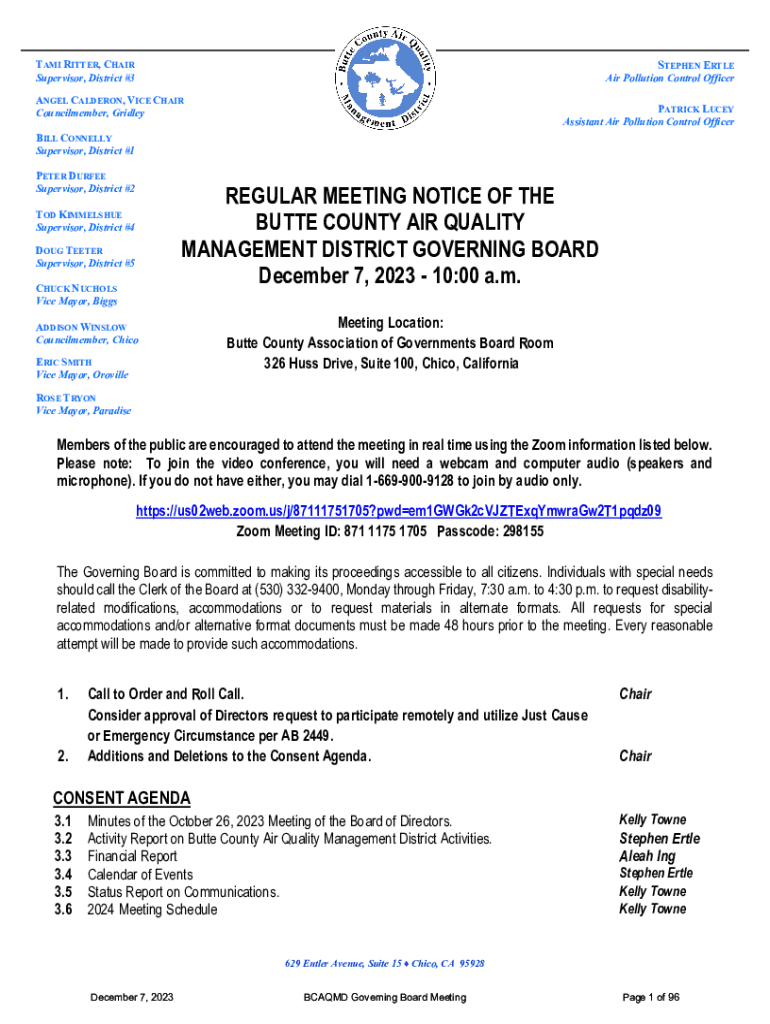 STEPHEN ERTLETAMI RITTER, CHAIR Supervisor, District #3Air Pollution Control OfficerANGEL CALDERON, VICE CHAIR Councilmember, GridleyPATRICK LUCEY Assistant Air Pollution Control OfficerBILL CONNELLY
