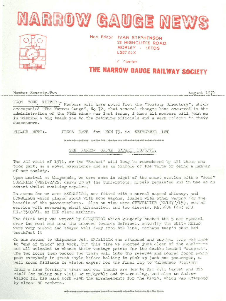 Hon. EditorIVANSTEPHENSON23 HIGHCLIFFE ROAD MORLEY LEEDS LS27 9LXreCopyrightTHE NARROW GAUGE RAILWAY SOCIETY ___ Number_SeventyTwoAugust_l971FROM YOUR EDITOR: Members will have noted from the \"Society