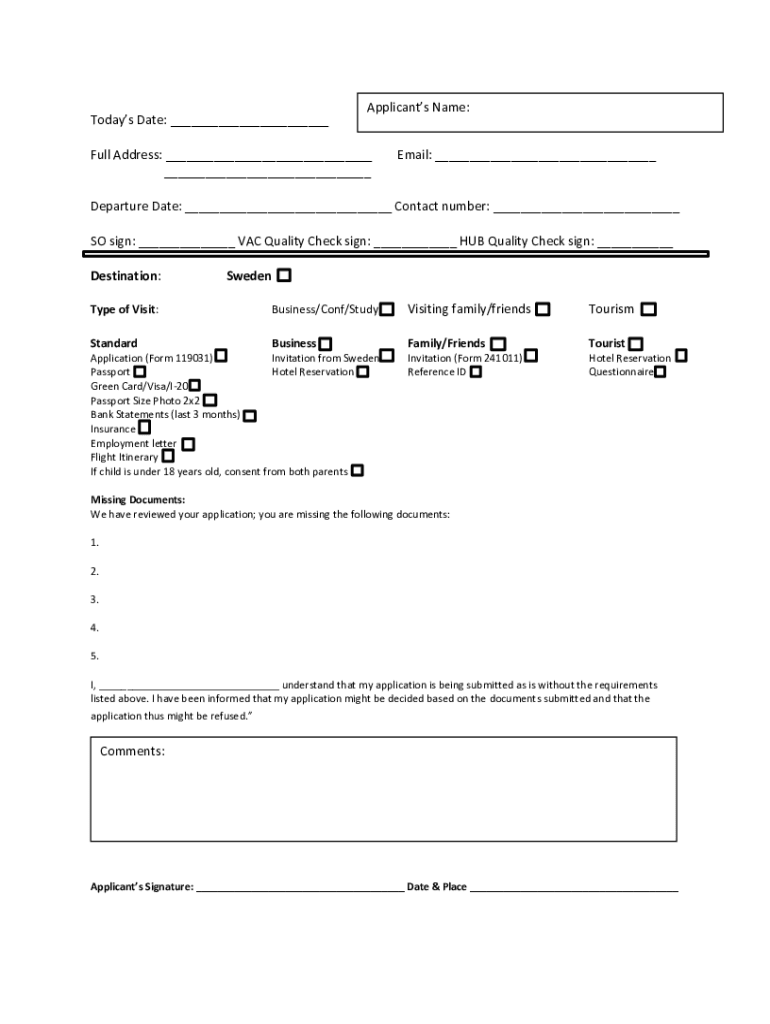 Todays Date: ___Applicants Name:Full Address: ___ ___Email: ___Departure Date: ___ Contact number: ___ SO sign: ___ VAC Quality Check sign: ___ HUB Quality Check sign: ___ Destination:SwedenType of