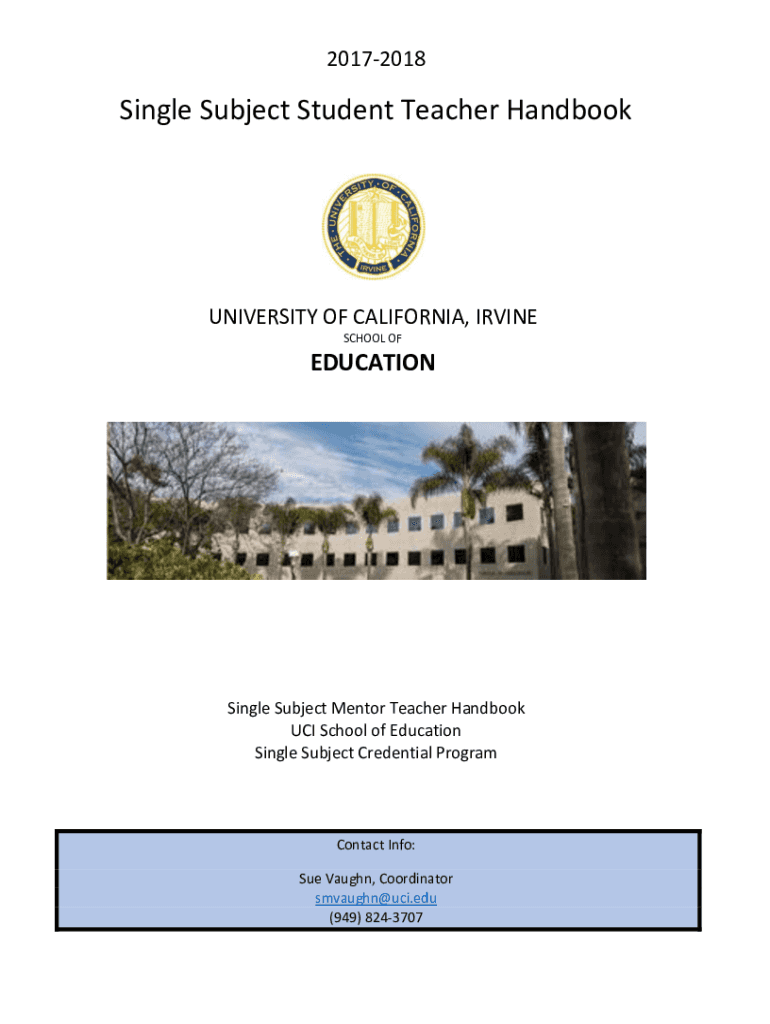 20172018Single Subject Student Teacher HandbookUNIVERSITY OF CALIFORNIA, IRVINE SCHOOL OFEDUCATIONSingle Subject Mentor Teacher Handbook UCI School of Education Single Subject Credential ProgramContact