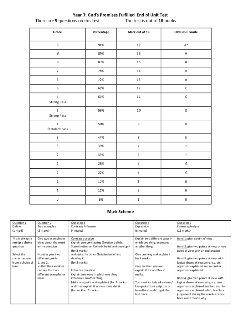 Year 7: Gods Promises FulfilledEnd of Unit TestThere are 5 questions on this test.The test is out of 18 marks.GradePercentageMark out of 18Old GCSE Grade994%17A*889%16A883%15A778%14B672%13B667%12C5Strong