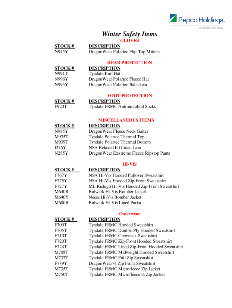 Winter Safety Items STOCK # N945YGLOVES DESCRIPTION DragonWear Polartec FlipTop MittensSTOCK # N991T N996Y N995YHEAD PROTECTION DESCRIPTION Tyndale Knit Hat DragonWear Polartec Fleece Hat DragonWear