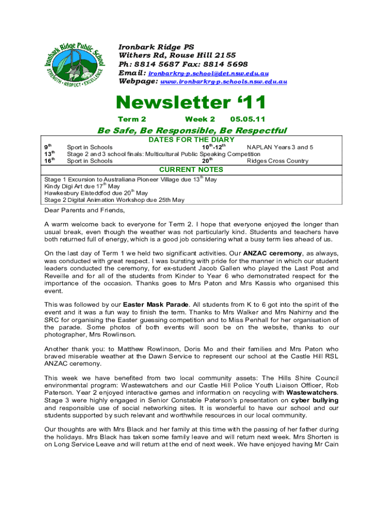 Ironbark Ridge PS Withers Rd, Rouse Hill 2155 Ph: 8814 5687 Fax: 8814 5698 Email: ironbarkrgp.school@det.nsw.edu.au Webpage: www.ironbarkrgp.schools.nsw.edu.auNewsletter 11 Term 2Week 205.05.11Be
