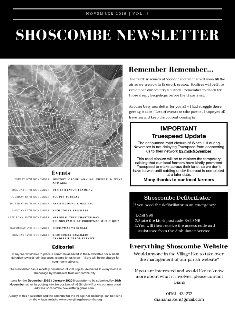 NOVEMBER 2019 | VOL. 3SHOSCOMBE NEWSLETTER Remember Remember... The familiar sounds of \"ooooh\" and \"ahhhs\" will soon fill the air as we are now in firework season. Bonfires will be lit to remember