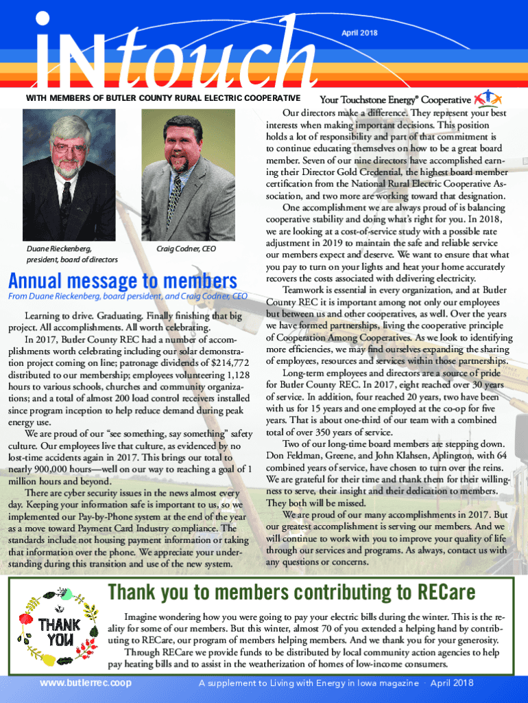 April 2018WITH MEMBERS OF BUTLER COUNTY RURAL ELECTRIC COOPERATIVEDuane Rieckenberg, president, board of directorsCraig Codner, CEOAnnual message to members From Duane Rieckenberg, board persident,