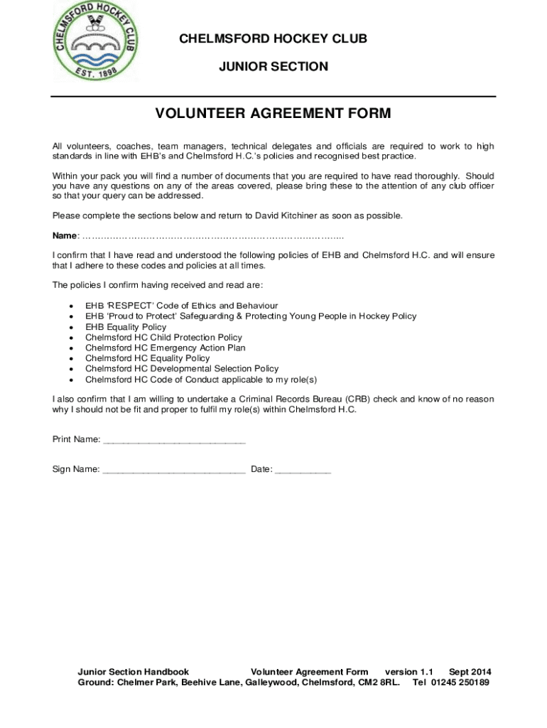 CHELMSFORD HOCKEY CLUB JUNIOR SECTIONVOLUNTEER AGREEMENT FORM All volunteers, coaches, team managers, technical delegates and officials are required to work to high standards in line with EHBs and