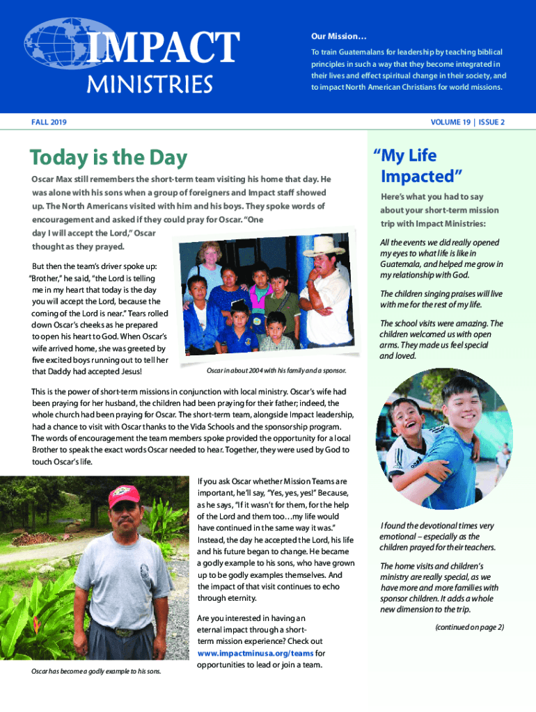 Our Mission To train Guatemalans for leadership by teaching biblical principles in such a way that they become integrated in their lives and effect spiritual change in their society, and to impact