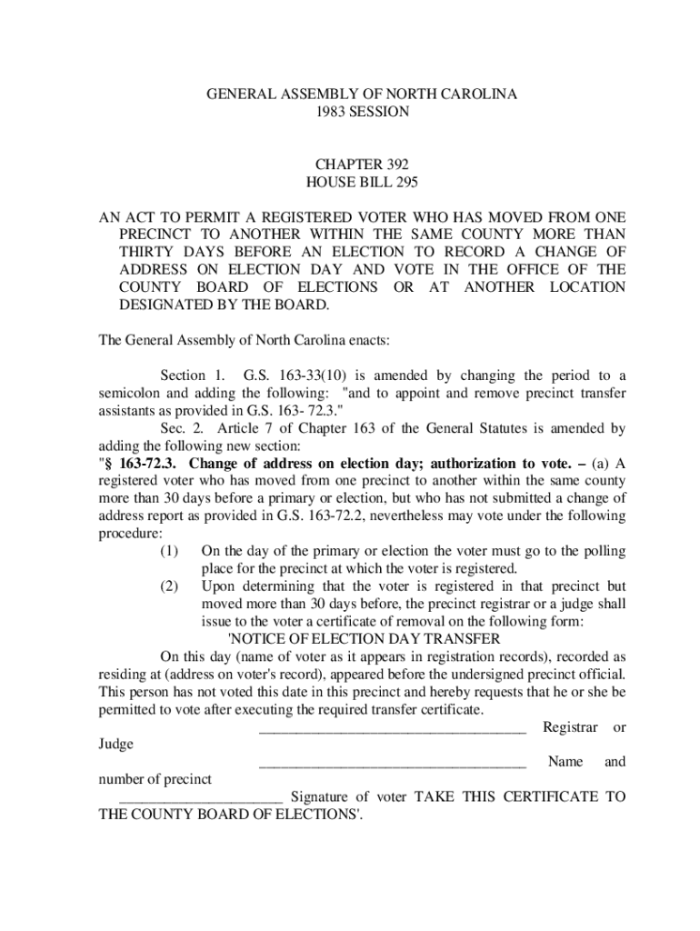 GENERAL ASSEMBLY OF NORTH CAROLINA 1983 SESSIONCHAPTER 392 HOUSE BILL 295 AN ACT TO PERMIT A REGISTERED VOTER WHO HAS MOVED FROM ONE PRECINCT TO ANOTHER WITHIN THE SAME COUNTY MORE THAN THIRTY DAYS