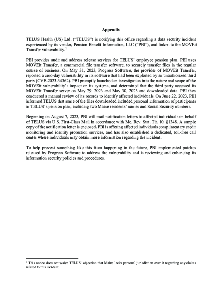Appendix TELUS Health (US) Ltd. (TELUS) is notifying this office regarding a data security incident experienced by its vendor, Pension Benefit Information, LLC (PBI), and linked to the MOVEit Transfer