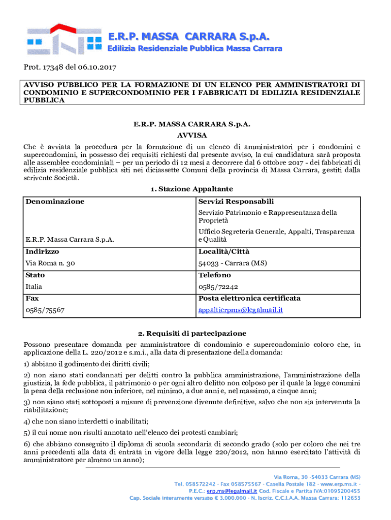 E.R.P. MASSA CARRARA S.p.A. Edilizia Residenziale Pubblica Massa Carrara Prot. 17348 del 06.10.2017 AVVISO PUBBLICO PER LA FORMAZIONE DI UN ELENCO PER AMMINISTRATORI DI CONDOMINIO E SUPERCONDOMINIO