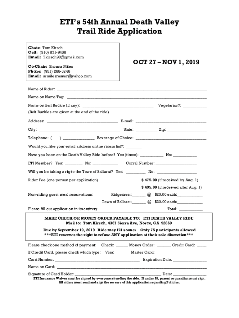 ETIs 54th Annual Death Valley Trail Ride Application Chair: Tom Kirsch Cell: (310) 8719458 Email: Tkirsch98@gmail.comOCT 27 NOV 1, 2019CoChair: Shonna Miles Phone: (951) 2885248 Email: srmilesrasner@yahoo.comName