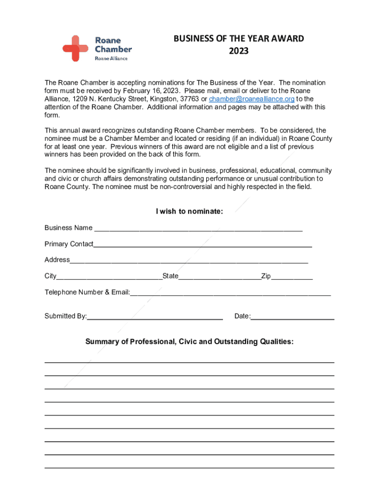 BUSINESS OF THE YEAR AWARD 2023 The Roane Chamber is accepting nominations for The Business of the Year. The nomination form must be received by February 16, 2023. Please mail, email or deliver to