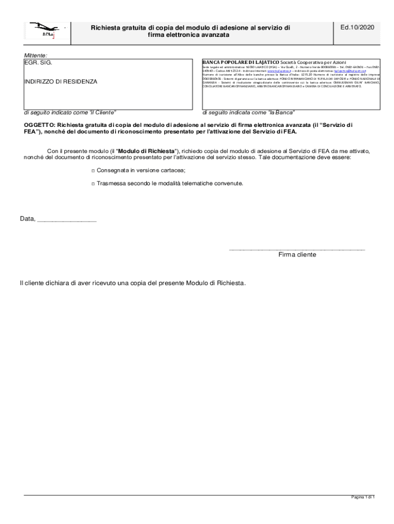 Richiesta gratuita di copia del modulo di adesione al servizio di firma elettronica avanzata Mittente: EGR. SIG.Ed.10/2020BANCA POPOLARE DI LAJATICO Societ Cooperativa per AzioniINDIRIZZO DI RESIDENZAdi
