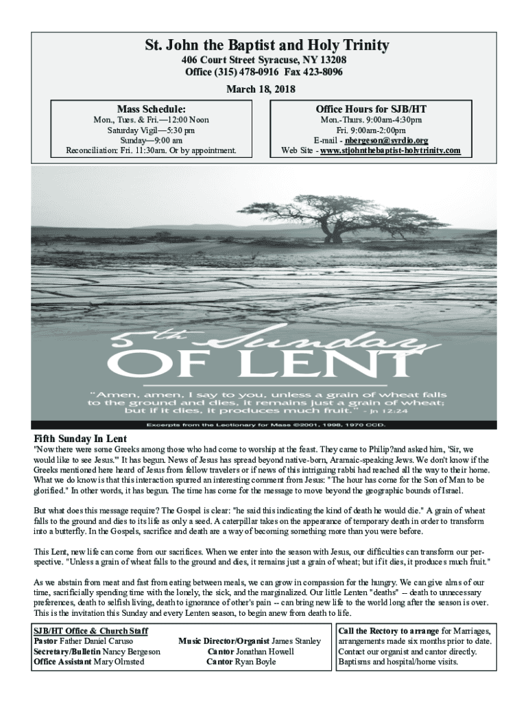 St. John the Baptist and Holy Trinity 406 Court Street Syracuse, NY 13208 Office (315) 4780916 Fax 4238096 March 18, 2018 Mass Schedule:Office Hours for SJB/HTMon., Tues. & Fri.12:00 Noon Saturday