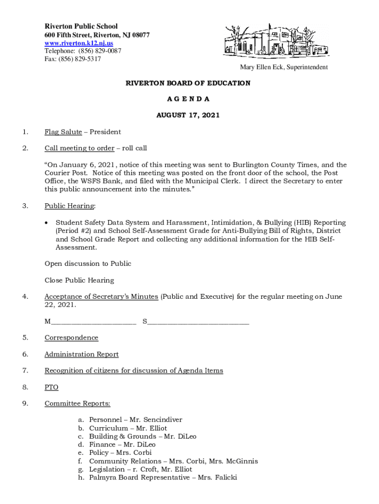 Riverton Public School 600 Fifth Street, Riverton, NJ 08077 www.riverton.k12.nj.us Telephone: (856) 8290087 Fax: (856) 8295317 Mary Ellen Eck, Superintendent RIVERTON BOARD OF EDUCATION AGENDA AUGUST