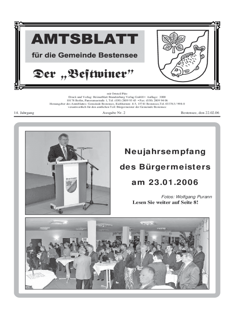 mit Ortsteil Ptz Druck und Verlag: Heimatblatt Brandenburg Verlag GmbH Auflage: 3000 10178 Berlin, Panoramastrae 1, Tel: (030) 2809 93 45 Fax: (030) 2809 94 06 Herausgeber des Amtsblattes: Gemeinde