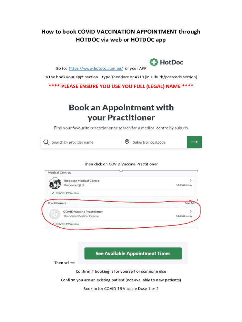 How to book COVID VACCINATION APPOINTMENT through HOTDOC via web or HOTDOC appGo to: https://www.hotdoc.com.au/ or your APP In the book your appt section type Theodore or 4719 (in suburb/postcode