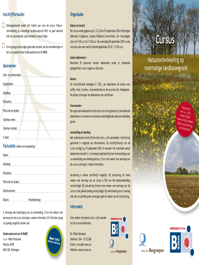 InschrijfformulierOndergetekende meldt zich hierbij aan voor de cursus Natuur ontwikkeling op voormalige landbouwgrond 2016 en gaat akkoord met de voorwaarden zoals vermeld in deze folder. Ik wil