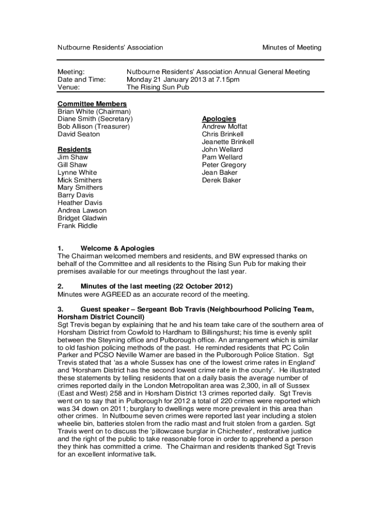 Nutbourne Residents AssociationMeeting: Date and Time: Venue:Nutbourne Residents Association Annual General Meeting Monday 21 January 2013 at 7.15pm The Rising Sun PubCommittee Members Brian White