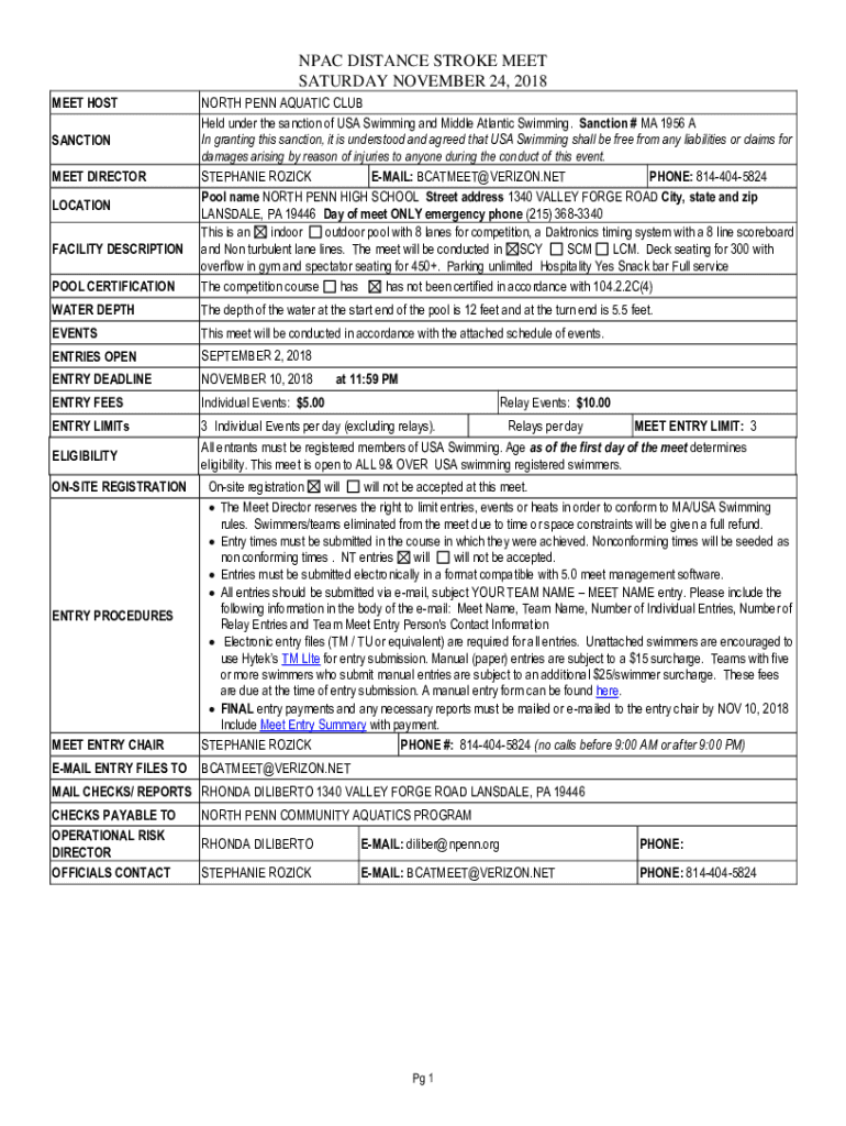 NPAC DISTANCE STROKE MEET SATURDAY NOVEMBER 24, 2018 MEET HOSTPOOL CERTIFICATIONNORTH PENN AQUATIC CLUB Held under the sanction of USA Swimming and Middle Atlantic Swimming. Sanction # MA 1956 A In