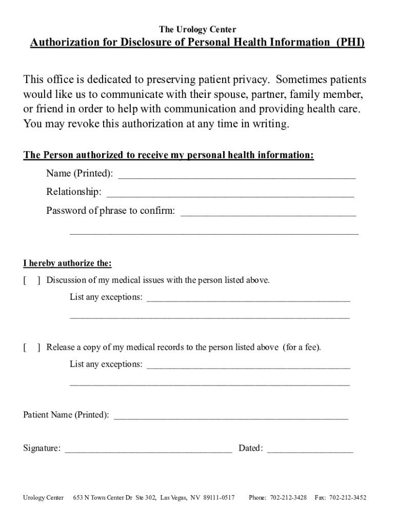 The Urology CenterAuthorization for Disclosure of Personal Health Information (PHI) This office is dedicated to preserving patient privacy. Sometimes patients would like us to communicate with their