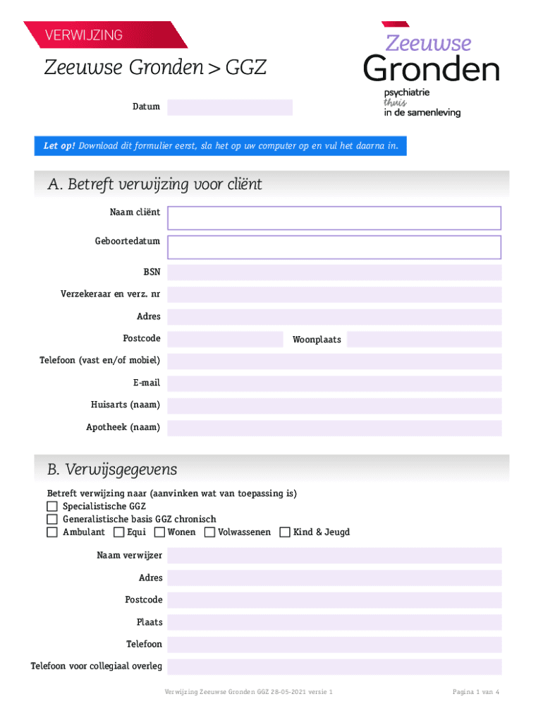 VERWIJZINGZeeuwse Gronden GGZ DatumLet op! Download dit formulier eerst, sla het op uw computer op en vul het daarna in.A. Betreft verwijzing voor clint Naam clint Geboortedatum BSN Verzekeraar en