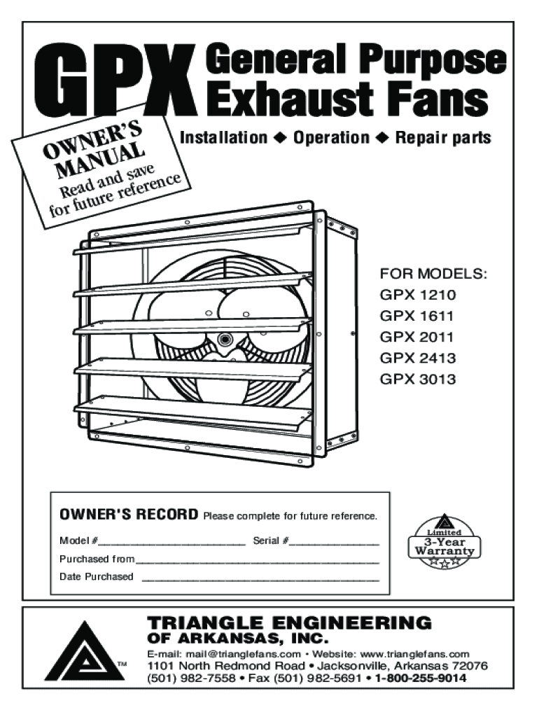RS E N OW NUAL MA d saveInstallation Operation Repair partsan nce Readure refere t for fu FORMODELS: GPX 1210 GPX 1611 GPX 2011 GPX 2413 GPX 3013OWNER\'S RECORD Please complete for future reference.