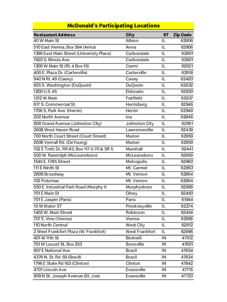 McDonald\'s Participating Locations Restaurant Address 40 W Main St 510 East Vienna, Box 584 (Anna) 1396 East Main Street (Univeristy Place) 1920 S. Illinois Ave. 1300 W Main St (Rt. 4 Box 15) 400