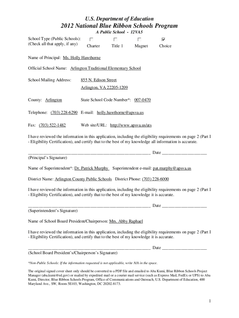 U.S. Department of Education2012 National Blue Ribbon Schools Program A Public School 12VA5 School Type (Public Schools): (Check all that apply, if any)CharterTitle 1MagnetChoiceName of Principal: