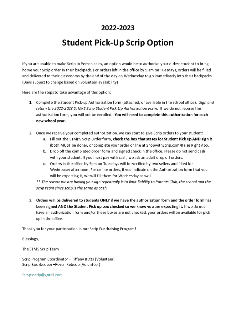 20222023Student PickUp Scrip Option If you are unable to make Scrip In Person sales, an option would be to authorize your oldest student to bring home your Scrip order in their backpack. For orders
