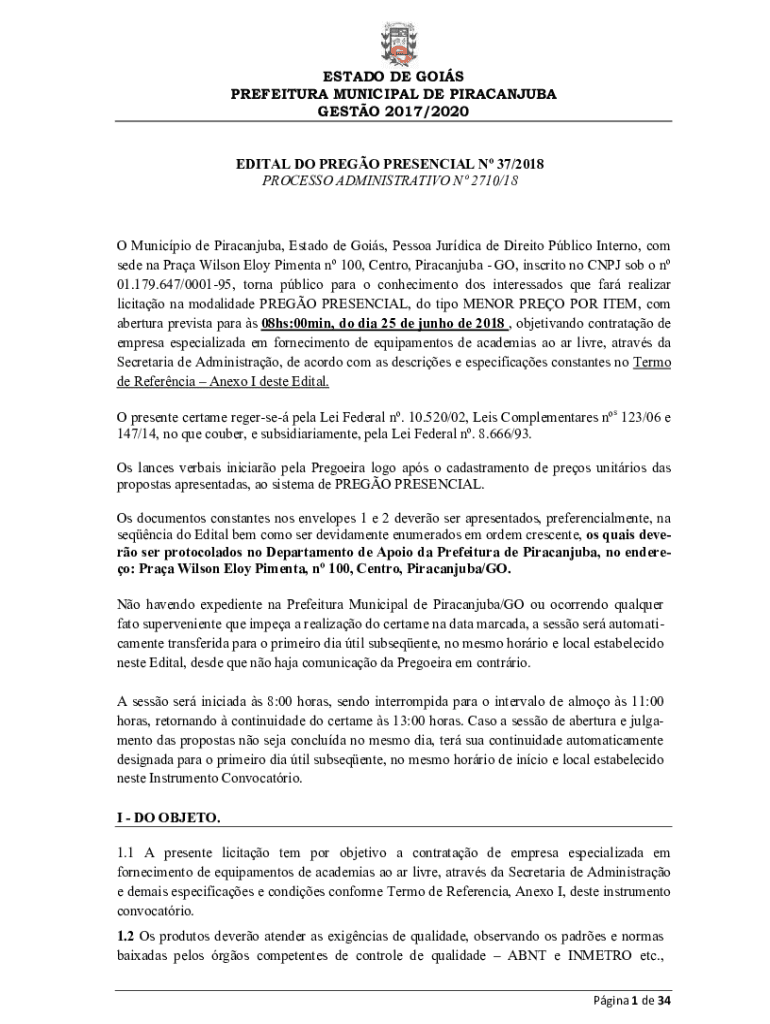 ESTADO DE GOIS PREFEITURA MUNICIPAL DE PIRACANJUBA GESTO 2017/2020EDITAL DO PREGO PRESENCIAL N 37/2018 PROCESSO ADMINISTRATIVO N 2710/18O Municpio de Piracanjuba, Estado de Gois, Pessoa Jurdica de