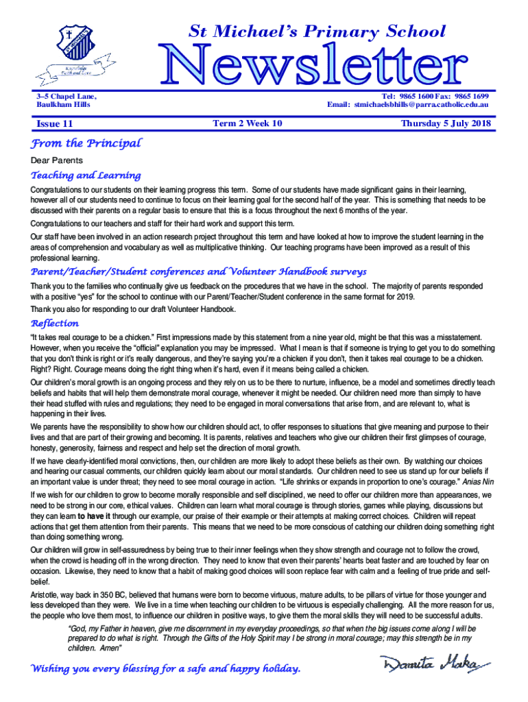 St Michaels Primary School35 Chapel Lane, Baulkham HillsIssue 11Tel: 9865 1600 Fax: 9865 1699 Email: stmichaelsbhills@parra.catholic.edu.auTerm 2 Week 10Thursday 5 July 2018From the Principal Dear