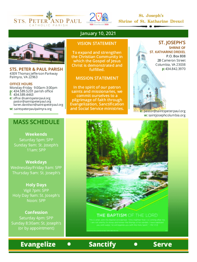 St. Josephs Shrine of St. Katharine DrexelJanuary 10, 2021 VISION STATEMENT To expand and strengthen the Christian Community in which the Gospel of Jesus Christ is demonstrated and fullled.STS. PETER