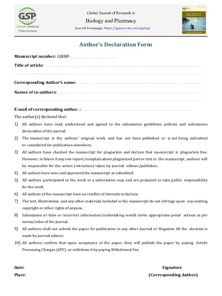The authors declaration form gjrbp is a document used by authors to declare their contributions and assert the originality of their work for publication in certain journals or for grant applications.