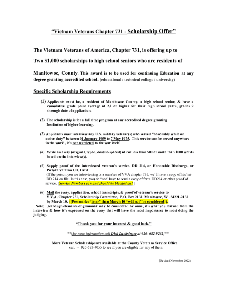Vietnam Veterans Chapter 731 Scholarship Offer The Vietnam Veterans of America, Chapter 731, is offering up to Two $1,000 scholarships to high school seniors who are residents of Manitowoc, County.