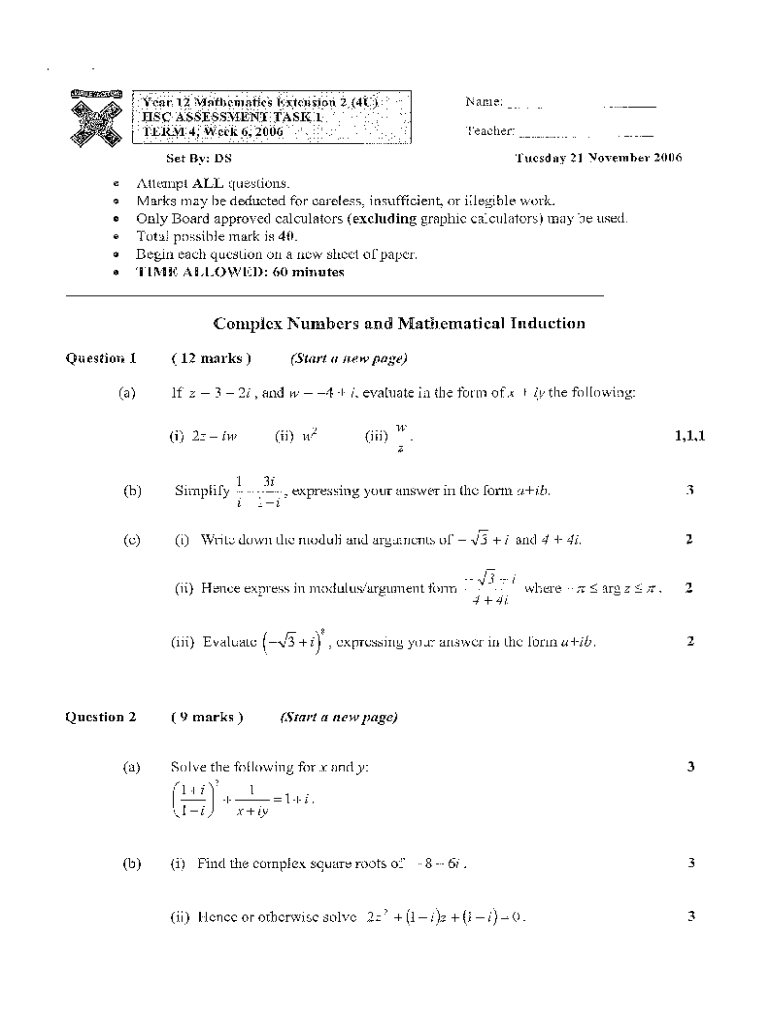Year 12 Mathematics Extension 2 (4U) Name : uSC ASSESSMENT TASK I___TERii 4, Week 6,2006 Teacher : ___ Set By : DS Tuesday 21 November 2006 o Attempt ALL questions .o Marks nlay be deducted for careless,