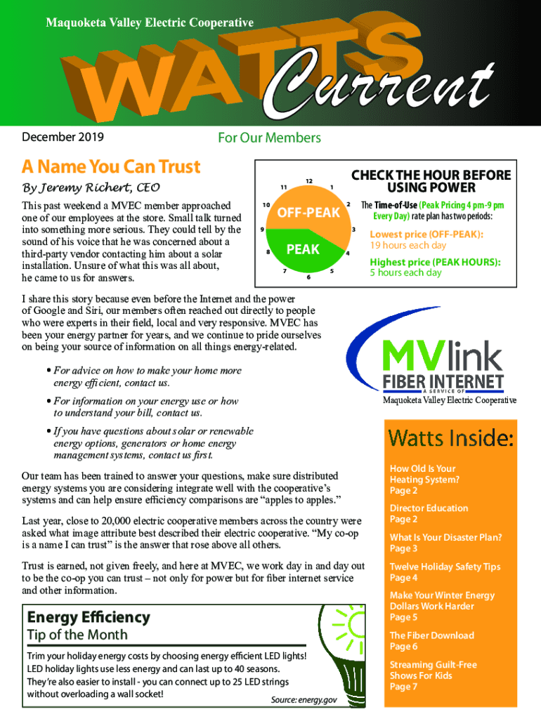 December 2019For Our MembersA Name You Can Trust By Jeremy Richert, CEO This past weekend a MVEC member approached one of our employees at the store. Small talk turned into something more serious.