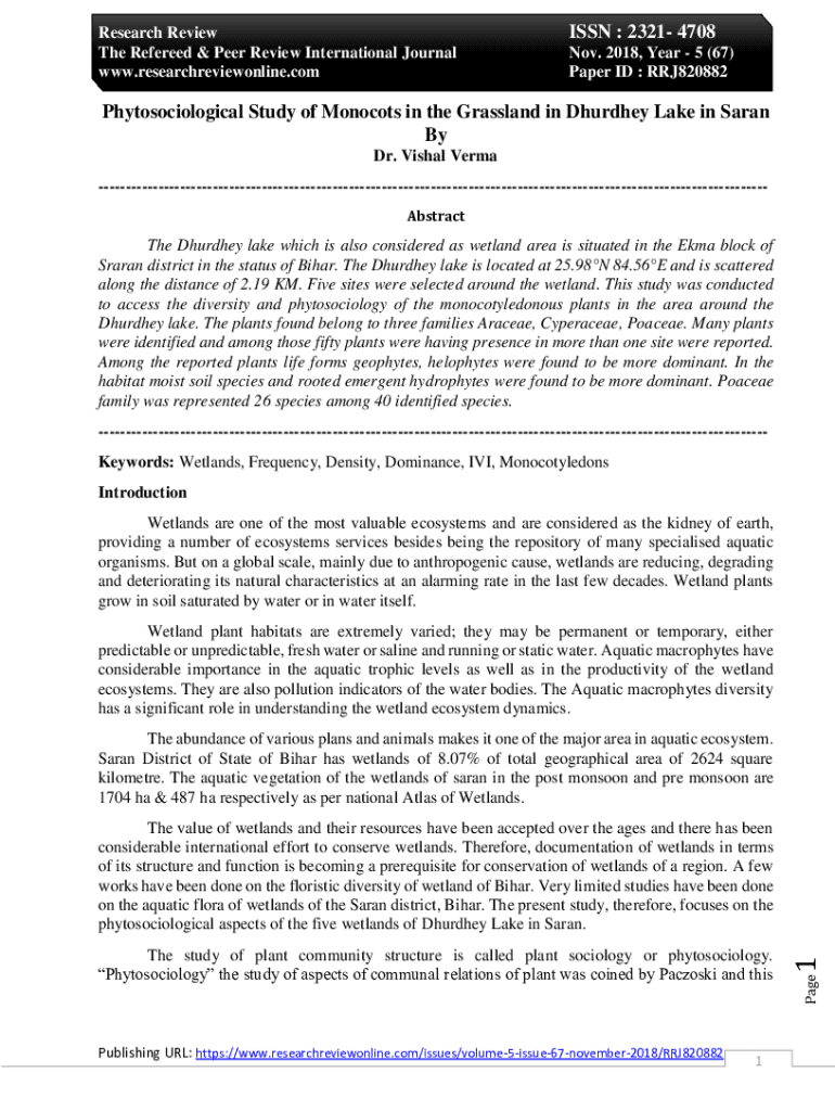Research Review The Refereed & Peer Review International Journal www.researchreviewonline.comISSN : 2321 4708 Nov. 2018, Year 5 (67) Paper ID : RRJ820882Phytosociological Study of Monocots in the