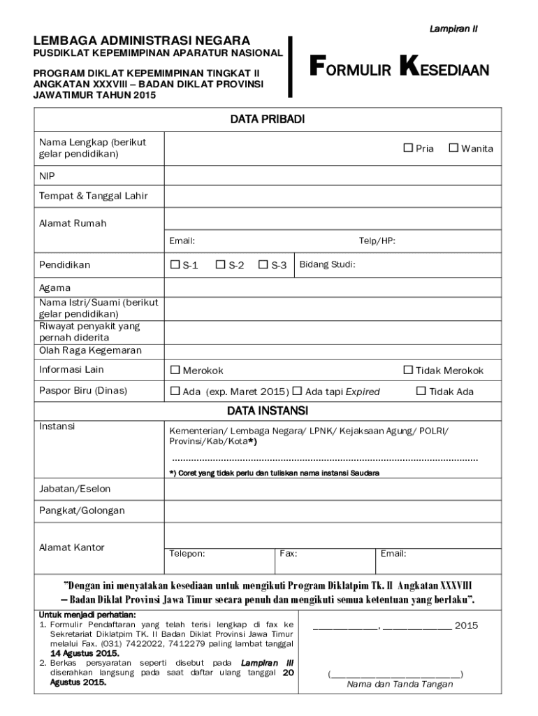 Lampiran IILEMBAGA ADMINISTRASI NEGARAFORMULIR KESEDIAANPUSDIKLAT KEPEMIMPINAN APARATUR NASIONAL PROGRAM DIKLAT KEPEMIMPINAN TINGKAT II ANGKATAN XXXVIII BADAN DIKLAT PROVINSI JAWATIMUR TAHUN 2015DATA