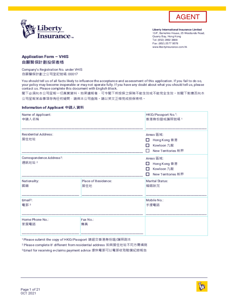 AGENT Liberty International Insurance Limited 13/F, Berkshire House, 25 Westlands Road, Quarry Bay, Hong Kong Tel: (852) 2892 3888 Fax: (852) 2577 9578 www.libertyinsurance.com.hkApplication Form