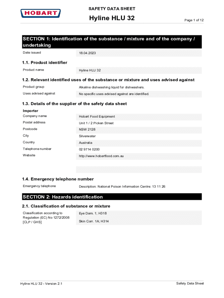 SAFETY DATA SHEETHyline HLU 32Page 1 of 12SECTION 1: Identification of the substance / mixture and of the company / undertaking Date issued18.04.20231.1. Product identifier Product nameHyline HLU