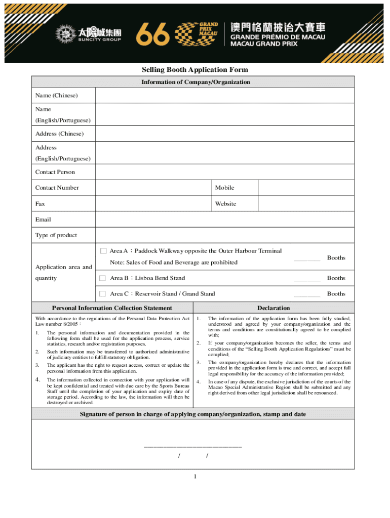 Selling Booth Application Form Information of Company/Organization Name (Chinese) Name (English/Portuguese) Address (Chinese) Address (English/Portuguese) Contact Person Contact NumberMobileFaxWebsiteEmail