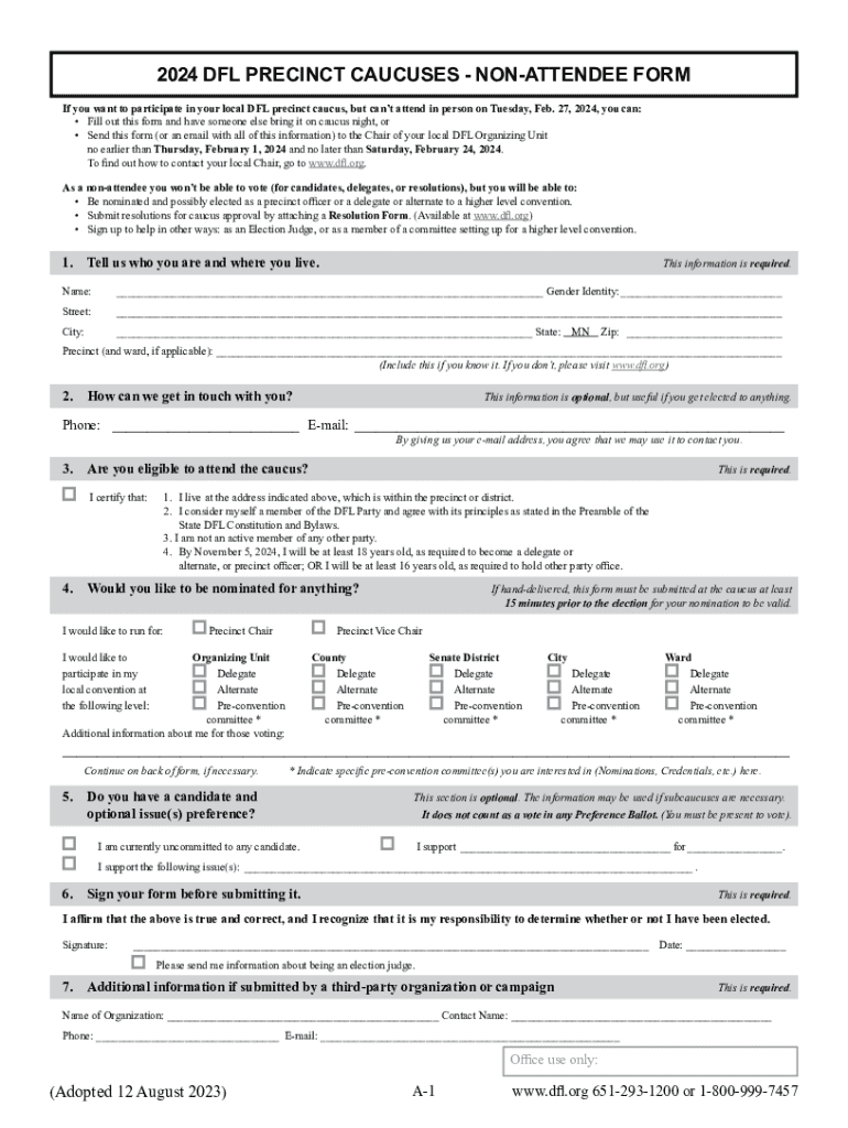 2024 DFL PRECINCT CAUCUSES NONATTENDEE FORM If you want to participate in your local DFL precinct caucus, but cant attend in person on Tuesday, Feb. 27, 2024, you can: Fill out this form and have